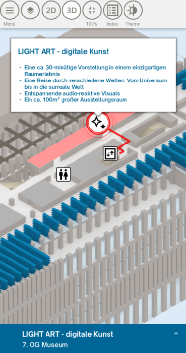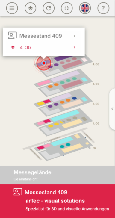 Interaktive Gesamtansicht: Die 2D/3D-Darstellung liefert mit der “Explosionsansicht” schnell den Überblick über gesamte Etagen und Gebäude, um die räumliche Orientierung zu erleichtern.
